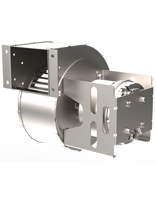 Le ventilateur centrifuge en forme d’escargot, de type action simple ouïe pour air chaud aspire l’air au centre et le rejette par une sortie latérale. Le ventilateur à action simple ouïe présente l’avantage d’être peu bruyant.
